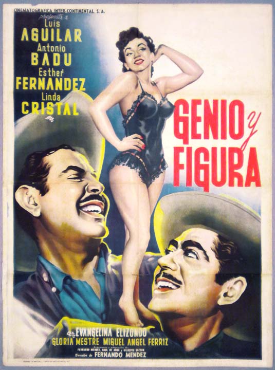 Fabulous Mexican comedy movie poster, features nice close-up images of the two male stars -- both of whom are admiring the very sexy and scantily clad Fernandez. There is some light edge/border wear -- but no major problems. Great onesheet!!!... The film starred Esther Fernandez, Luis Aguilar, Antonio Badu, Sara Garcia, Linda Cristal and Evangelina Elizondo. $65 |