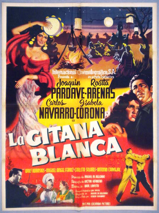 Great Mexican movie poster features a montage of images from the film, with a particularly sexy rendition of Rosita Arenas. Colorful art work, with a Gypsy motif. There is wear along the folds, but the poster will display beautifully... The film starred Joaquin Pardave, Carlos Navarro, Isabela Corona and Wolf Ruvinskis. $95 |