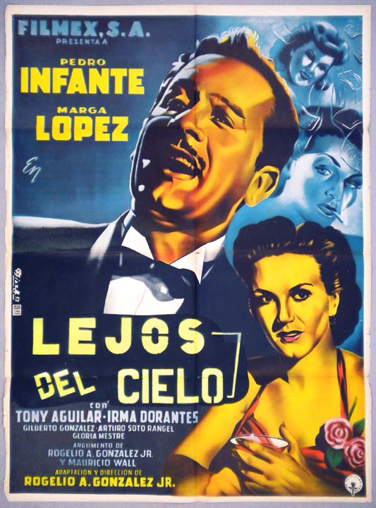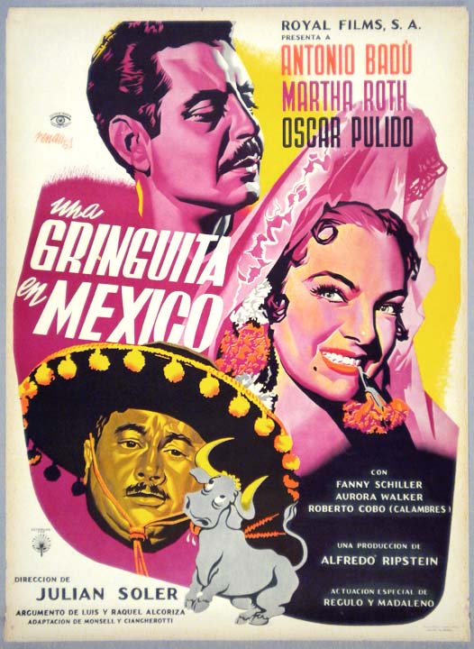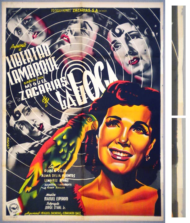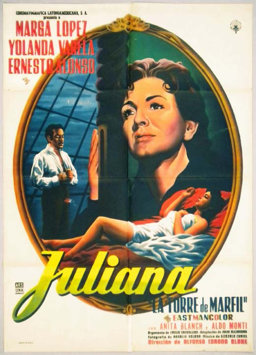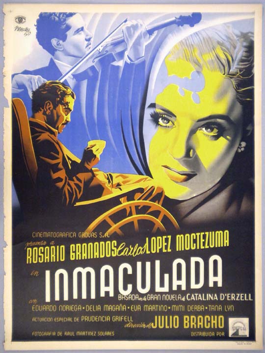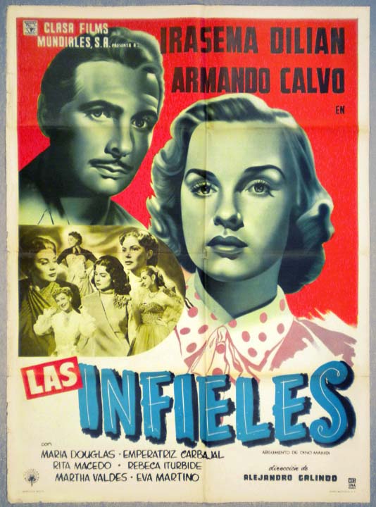 Attractive Mexican movie poster with great color and an interesting design -- as if it were reflected in a mirror. The graphics include a nice close-up image of Ms. Lopez... The film starred Marga Lopez, Yolanda Varela, Ernesto Alonso, Anita Blanch and Aldo Monti. $45 |