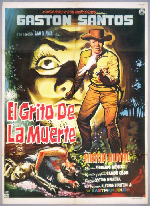 Atmospheric Mexican western / horror movie poster has a great action portrait of cowboy star / real life bullfighter, Gaston Santos. Surrounding Santos is the sinister face of a llorona and various other horrifying images. The film was released in the USA as, The Living Coffin. The film starred Gaston Santos, Maria Duval, Pedro de Aguillon and Carlos Ancira. $65 |