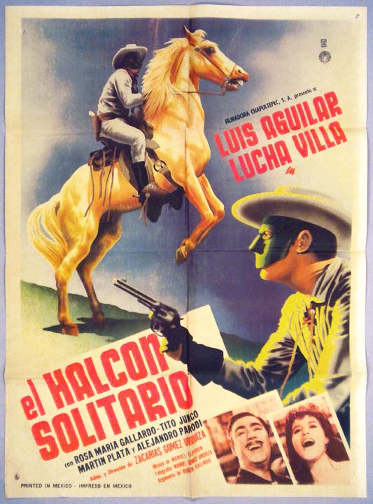 Appealing Mexican western movie poster pictures the 'Lone Ranger' masked hero on a rearing white horse. A Classic!... The film starred Luis Aguilar, Lucha Villa, Tito Junco and Rosa Maria Gallardo. $125 |