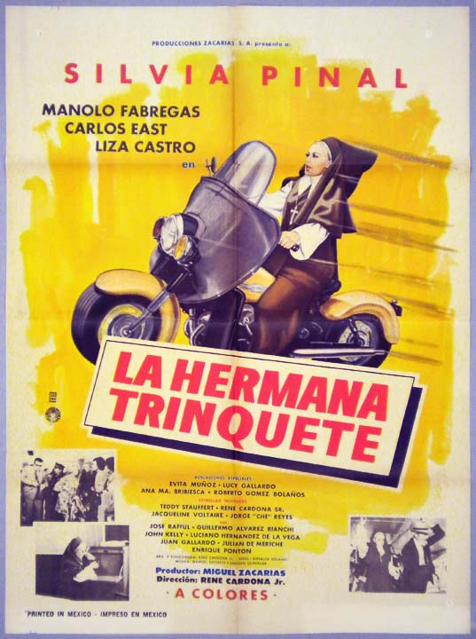 Eye-catching Mexican movie poster shows the beautiful Silvia Pinal, in a nun's costume, riding a Harley Davidson motorcycle. What more could anyone want?... The film starred Silvia Pinal, Manolo Fabregas, Carlos East and Liza Castro. $85 |