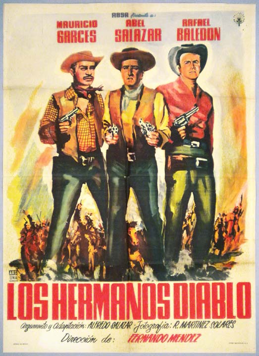 Attractive Mexican western movie poster with a nice image of the three rugged stars... The film starred Mauricio Garces, Abel Salazar, Rafael Baledon and Dacia Gonzalez. $55 |