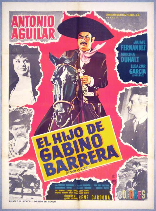 Appealing Mexican western movie poster with a fine mix of color and B&W graphics... The film starred Antonio Aguilar, Jaime Fernandez, Martha Dual and Eleazar Garcia. $65 |
