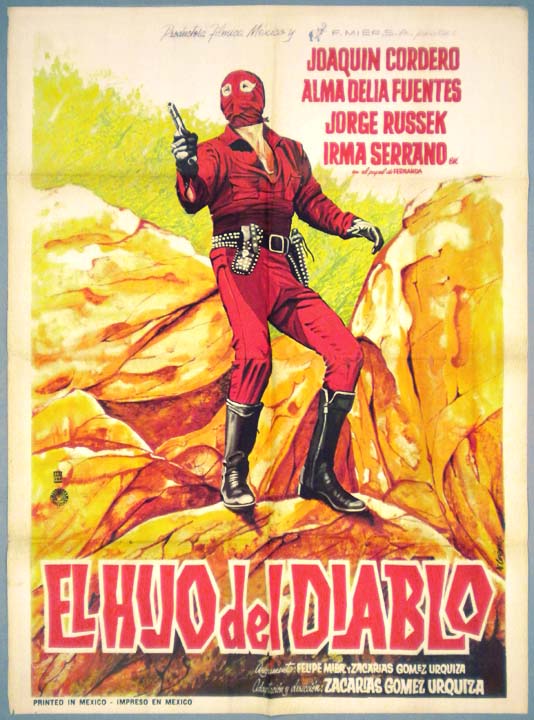 Striking Mexican western movie poster with a great image of a red-clad masked hero standing in a rocky terrain... The film starred Joaquin Cordero, Alma Delia Fuentes, Jorge Russek and Irma Serrano. $55 |