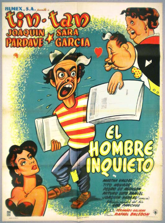 Wonderful Mexican 'Tin Tan' comedy movie poster features vivid coloring and a great image of the popular Mexican comedian as a newsboy -- hawking a paper. There is some wear along the edge of the left border, but this flaw does not affect the beautiful image area. Otherwise, the poster looks great... The film starred German 'Tin Tan' Valdes, Joaquin Pardave, Sara Garcia, Martha Valdes and Tito Novaro. $195 |