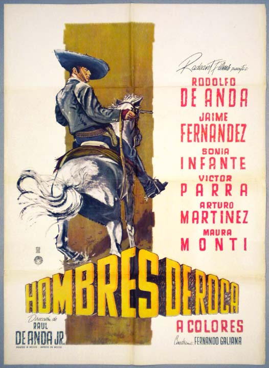Superb Mexican western movie poster features a classic image of a charro on horseback. Great color and design. There is some mild discoloration along the borders, plus two repaired dime sized holes, but these were very well done and are not very noticeable. The poster looks great and will display beautifully... The film starred Rodolfo de Anda, Jaime Fernandez, Graciela Lara, Andres Soler and Crox Alvarado. $95 |