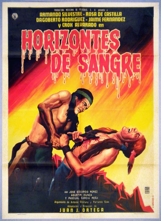 Colorful Mexican western movie poster features a central image of a death struggle between two Indians... The film starred Armando Silvestre, Rosa de Castilla, Dagoberto Rodriguez, Jaime Fernandez and Crox Alvarado. $65 |