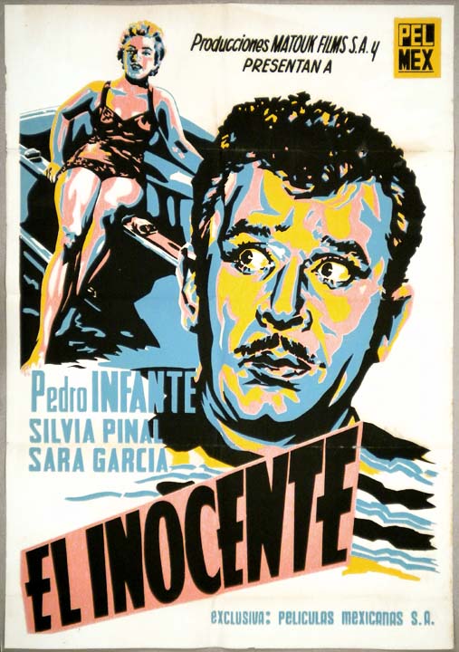 Very Colorful Argentine onesheet poster (29x43") from a classic Mexican comedy / romance movie. The one-sheet features a great portrait of a befuddled Infante, plus a smaller image of the sexy Ms. Pinal. Simply beautiful!... The film starred Pedro Infante, Silvia Pinal, Sara Garcia, Oscar Ortiz de Pinedo and Armando Saenz. (This poster is mounted on linen, so it must be sent rolled.) $395 |