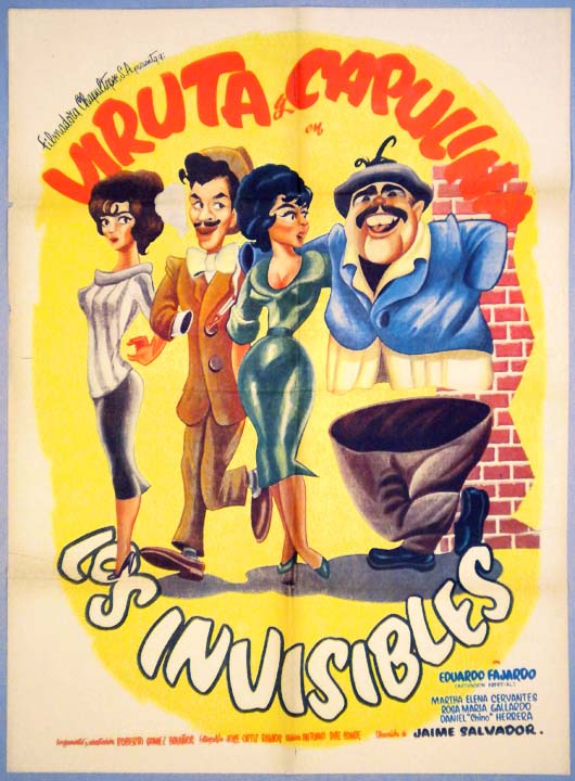 Colorful Mexican Viruta y Capulina comedy / science fiction movie poster pictures two sexy women with the two funny men -- each of whom is partially invisible... The film starred Marco Antonio Campos'Viruta,' Gaspar Henaine'Capulina,' Marta Elena Cervantes and Rosa Maria Gallardo. $95 |