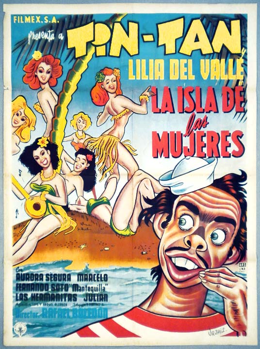 Great Mexican comedy movie poster shows comedian 'Tin Tan' on an island, surrounded by scantily-clad women. Superb graphics! It appears that this poster got damp / wet at some point and some light water damage has resulted. However, these water marks are not very noticeable or distracting -- and otherwise -- the colors are clean and bright... The film starred German 'Tin Tan' Valdes, Lilia del Valle, Marcelo Chavez, Mantequilla, Carlota Solares and Aurora Segura. $185 |