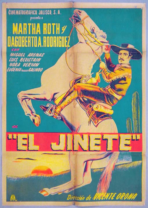 Rare early western film poster has attractive stone litho graphics. This was only the third film even shot in the 3-D process in Mexico. The onesheet shows valiant cabellero, Dagoberto Rodriguez, on horseback. The vertical fold line has been reinforced on the back with acid-free, archival tape -- and there is also some wear / restoration along this fold. However, this flaw is not too distracting, and otherwise, the poster is still quite presentable... The film starred Martha Roth, Miguel Arenas, Luis Beristain and Nora Veryan. $55 |