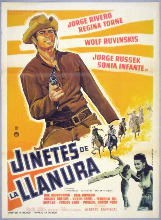 Colorful Mexican western movie poster pictures handsome Jorge Rivero as a gunfighter. The beefcake star is surrounded by a small montage of scenes from the film... The film also starred Regina Torne, Wolf Ruvinskis, Jorge Russek, Sonia Infante and Noe Murayama. (This poster has only limited, very mild fold lines -- so it will be sent rolled.) $55 |
