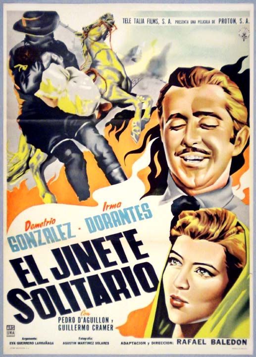 Beautiful Mexican western movie poster pictures a masked heroic rider, plus features attractive caracatures of the two main stars... The film starred Demetrio Gonzalez, Irma Dorantes, Pedro de Aguillon, Guillermo Cramer and Fernando Curiel. (This poster has only limited, very mild fold lines -- so it will be sent rolled.) $125 |
