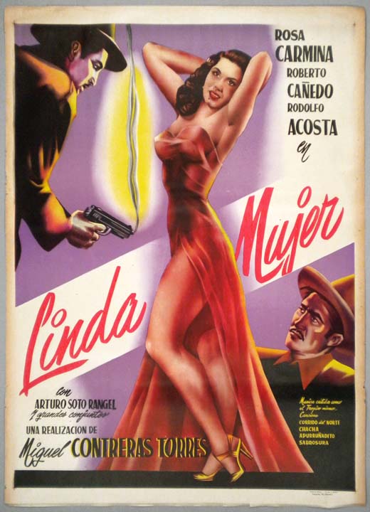 Stunning noir / crime film poster with art work that is simply perfect! The onesheet portrays classic elements of the film noir genre -- an incredibly sexy femme fatale and a thug holding a smoking gun. Out of hundreds of Mexican posters in my collection, this is one of only three that I have hanging on my wall! Some light edge wear... The film starred Rosa Carmina, Roberto Canedo, Rodolfo Acosta and Arturo Soto Rangel. (This poster is rolled.) $295 |