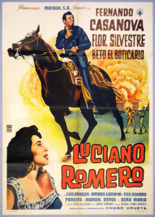 Appealing Mexican western movie poster pictures Fernando Casanova on horseback, with Ms. Silvestre singing a song... The film starred Flor Silvestre, Beto El Boticario, Luis Aragon and Amado Zumaya. $45 |