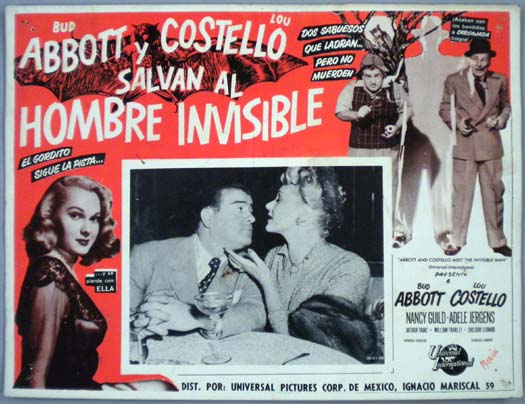 Original Mexican jumbo lobby card (12.5x16.5") from the 1951 Universal sci-fi / comedy film, ABBOTT AND COSTELLO MEET THE INVISIBLE MAN, which starred Bud Abbott, Lou Costello, Nancy Guild, Arthur Franz and Adele Jergens. The film was directed by Charles Lamont. $25 |