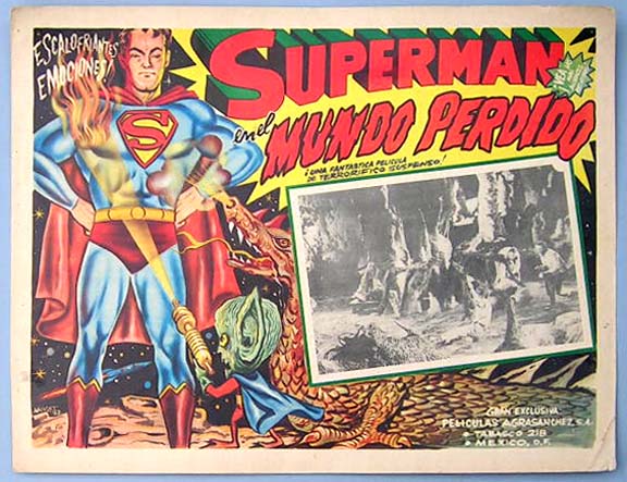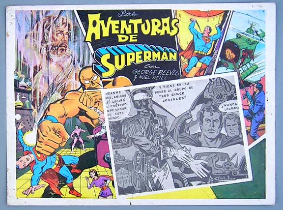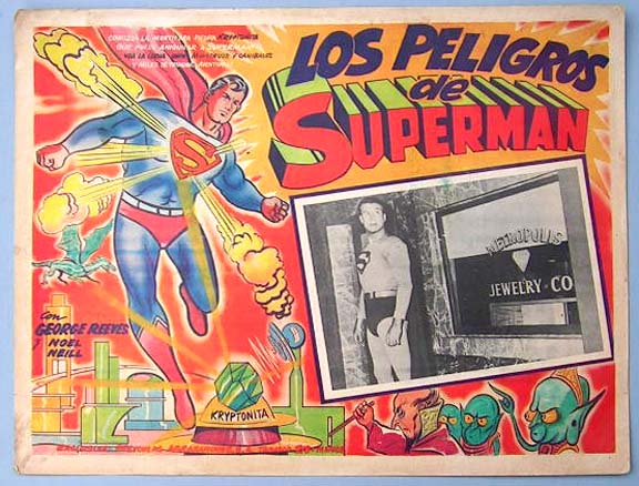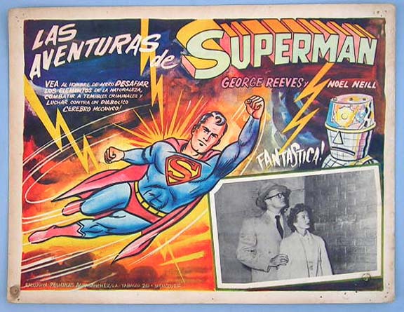 Colorful Mexican jumbo lobby card (11.5x15.5") from the 1950s MPTV adventure / sci-fi film, ADVENTURES OF SUPERMAN, which starred George Reeves, Noel Neill, Jack Larson, John Hamilton and Robert Shayne. This card is from a reissue of the film. $15 each |