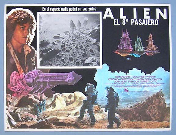 Beautiful Mexican jumbo lobby card (12.5x16.5") from the 1979 20th Century Fox horror / sci-fi film, ALIEN, which starred Tom Skerritt, Sigourney Weaver, Veronica Cartwright, Harry Dean Stanton, John Hurt, Ian Holm, Yaphet Kotto, Bolaji Badejo and Helen Horton. $35 each |