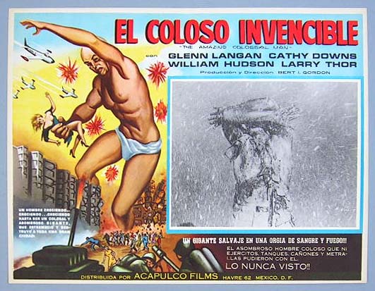 Beautiful Mexican lobby card (11x14") from the 1957 AIP sci-fi film, AMAZING COLOSSAL MAN, which starred Glenn Langan, Cathy Downs, William Hudson, Larry Thor, James Seay, Frank Jenks and Russ Bender. $45 each |