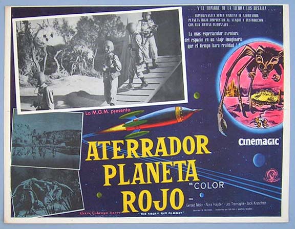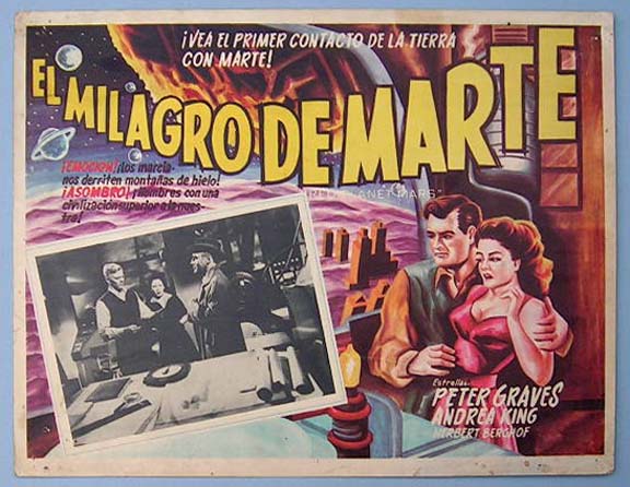 Beautiful Mexican jumbo lobby card (12.5x16.5") from the 1952 United Artists sci-fi / red scare film, RED PLANET MARS, which starred Peter Graves, Andrea King, Herbert Berghof, Walter Sande, Marvin Miller, Willis Bouchey and Morris Ankrum. $25 each |