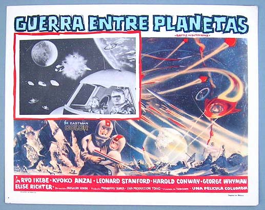 Beautiful Mexican lobby card (11x14") from the 1960 Toho / Japanese sci-fi film, BATTLE IN OUTER SPACE, which starred Ryo Ikebe, Kyoko Anzai, Koreya Senda, Minoru Takada, Leonard Stanford, Harold Conway and Yoshio Tsuchiya. $20 each |