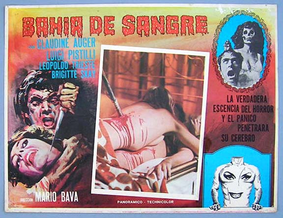 Beautiful Mexican jumbo lobby card (12.5x16.5") from the 1971 Italian horror film, A BAY OF BLOOD, which starred Claudine Auger, Luigi Pistilli, Claudio Camaso, Anna Maria Rosati, Chris Avram and Isa Miranda. The film was directed by Mario Bava. the movie was released in Italy as, Reazione a Catena. $25 |