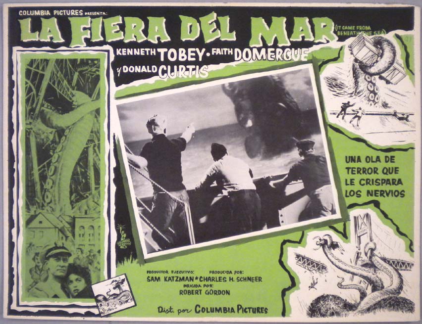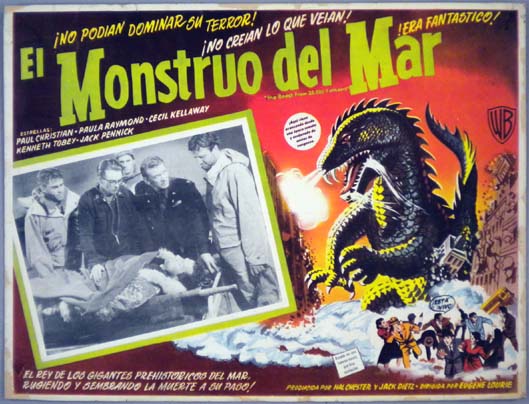 Beautiful Mexican jumbo lobby card (12.5x16.5") from the 1953 Warner Brothers sci-fi / dinosaur film, BEAST FROM 20,000 FATHOMS, which starred Paul Hubschmid, Paula Raymond, Cecil Kellaway, Kenneth Tobey, Donald Woods and Lee Van Cleef. The film was directed by Eugene Lourie, with special effects by Ray Harryhausen. The card has some repairs along the edges, but otherwise, it is in great shape. $85 |