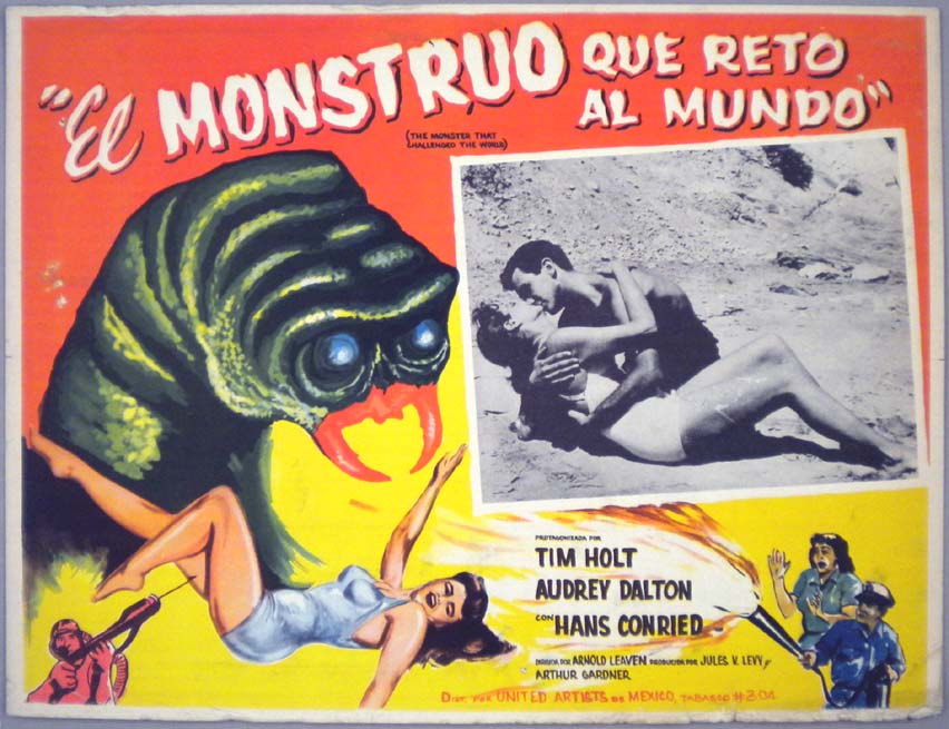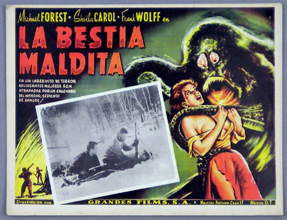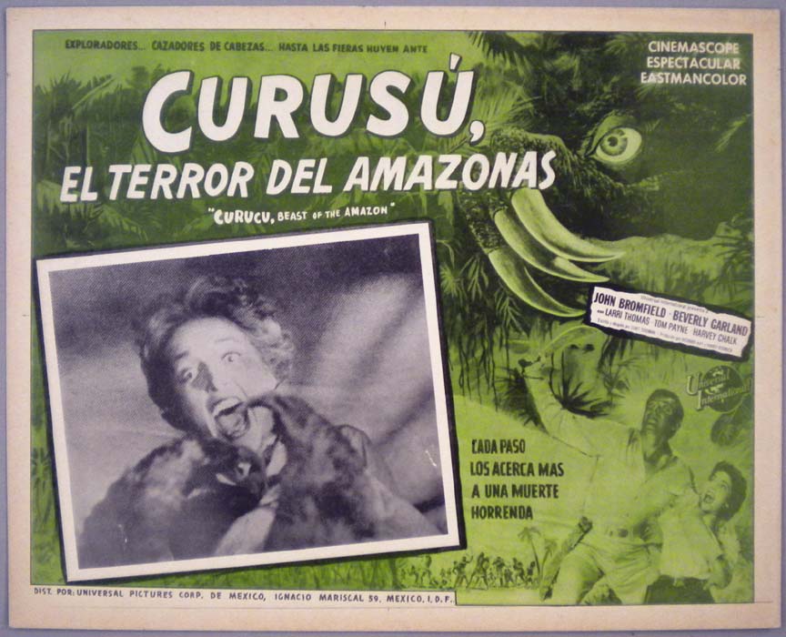 Great Mexican jumbo lobby card (12.5x15.5") from the 1956 Universal horror film, CURUCU BEAST OF THE AMAZON, which starred John Bromfield, Beverly Garland, Tom Payne and Harvey Chalk. $20 |