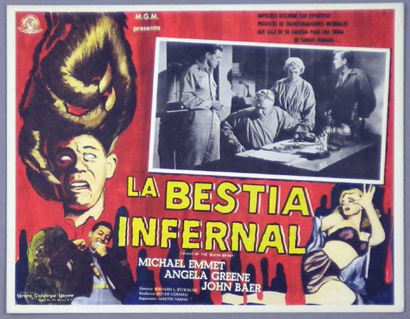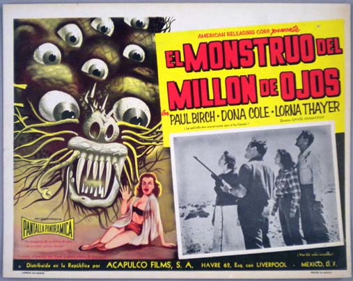Beautiful Mexican lobby card (11x14") from the 1955 American Released Group sci-fi film, THE BEAST WITH 1,000,000 EYES, which starred Paul Birch, Lorna Thayer, Dona Cole, Leonard Tarver, Dick Sargent. The film was directed by Roger Corman. $75 |