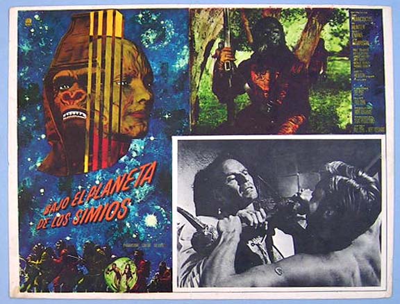 Beautiful Mexican jumbo lobby card (12.5x16.5") from the 1970 20th Century Fox sci-fi / action film, BENEATH THE PLANET OF THE APES, which starred James Franciscus, Kim Hunter, Maurice Evans, Linda Harrison, Paul Richards and Charlton Heston. $25 each |