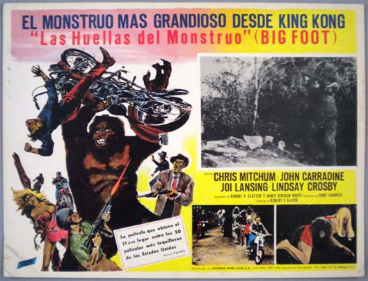 Beautiful Mexican jumbo lobby card (12.5x16.5") from the 1970 Ellman horror / sci-fi film, BIGFOOT, which starred John Carradine, Joi Lansing, Judith Jordan, John Mitchum and James Craig. $20 each |