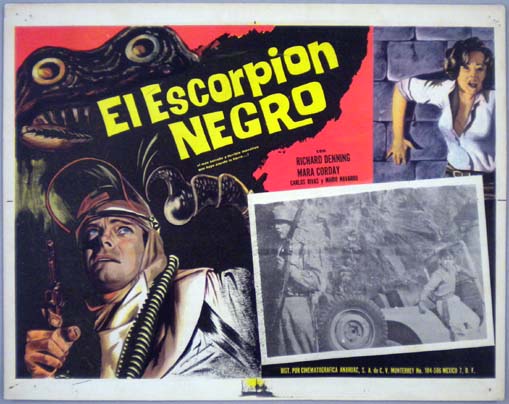 Beautiful Mexican jumbo lobby card (12.75x16") from the 1957 Warner Brothers sci-fi / horror / monster film, THE BLACK SCORPION, which starred Richard Denning, Mara Corday, Carlos Rivas and Mario Navarro. The film was directed by Edward Ludwig, with special effects by Willis H. O'Brien. $35 |