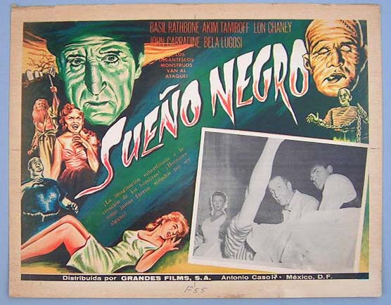 Classic Mexican jumbo lobby card (13x16.5") from the 1943 Universal horror / vampire film, SON OF DRACULA, which starred Lon Chaney Jr., Robert Paige, Louise Allbritton, Evelyn Ankers and Frank Craven. The film was directed by Robert Siodmak. The card was likely a reissue from the 1950s or 1960s. $35 each |