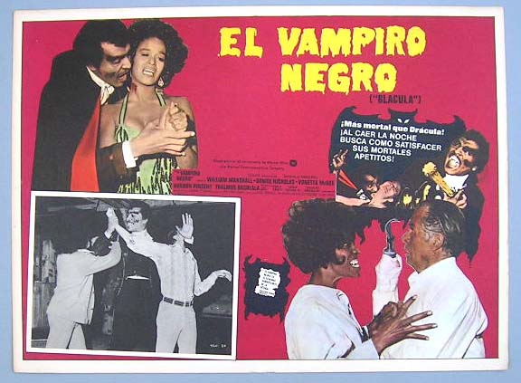 Beautiful Mexican jumbo lobby card (12.5x16.5") from the 1972 AIP horror / vampire / Blaxploitation film, BLACULA, which starred William Marshall, Vonetta McGee, Denise Nicholas, Thalmus Rasulala, Gordon Pinsent and Elisha Cook Jr. $20 each |