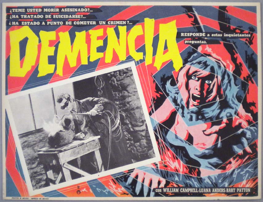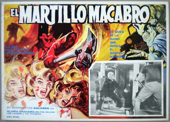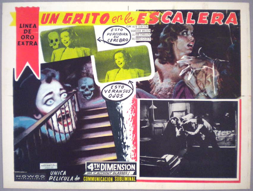 Rare Mexican jumbo lobby card (12.75x16.5") from the 1959 Howco horror / gimmick film, TERROR IN THE HAUNTED HOUSE, which starred Gerald Mohr, Cathy O'Donnell, William Ching, John Qualen and Barry Bernard. TERROR IN THE HAUNTED HOUSE was also known as, MY WORLD DIES SCREAMING. The film featured a gimmick called, Psychorama -- which consisted of subliminal images that would appear briefly between frames of the film. $25 |