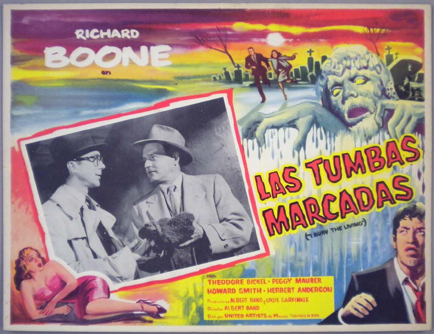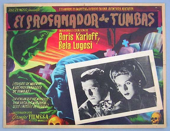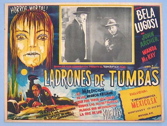 Great Mexican jumbo lobby card (12.5x16.5") from the 1959 DCA cult sci-fi film, PLAN NINE FROM OUTER SPACE, which starred Bela Lugosi, Vampira, Tor Johnson, Criswell, Gregory Walcott, Mona McKinnon, Duke Moore, Tom Keene, Carl Anthony, Paul Marco, Dudley Manlove, Joanna Lee, John Breckinridge and Lyle Talbot. The film was directed by Edward D. Wood Jr. $95 each |