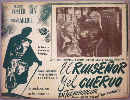 Rare Mexican jumbo lobby card (12.25x16") from the 1944 Universal horror film, THE CLIMAX, which starred Boris Karloff, Susanna Foster, Turhan Bey, Gale Sondergaard, Thomas Gomez and June Vincent. This is a very early and rare card which is printed on heavy cardboard. $25 |