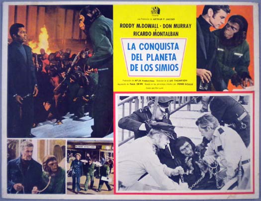 Beautiful Mexican jumbo lobby card (12.5x16.25") from the 1972 20th Century Fox sci-fi film, CONQUEST OF THE PLANET OF THE APES, which starred Roddy McDowall, Don Murray, Natalie Trundy, Hari Rhodes and Severn Darden. $20 each |