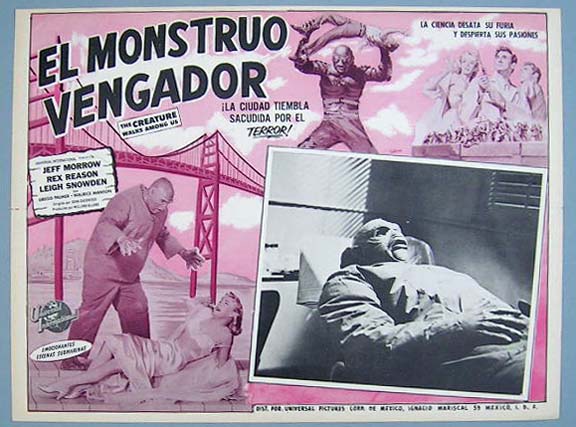 Original Mexican jumbo lobby card (12.5x16.5") from the 1956 Universal sci-fi / monster film, THE CREATURE WALKS AMONG US, which starred Jeff Morrow, Rex Reason, Leigh Snowden, Gregg Palmer and Maurice Manson. THE CREATURE WALKS AMONG US was the third film in the Creature from the Black Lagoon monster film series. $45 each |