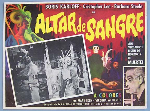 Beautiful Mexican jumbo lobby card (12.5x16.5") from the 1968 British / AIP horror film, THE CRIMSON CULT which starred Boris Karloff, Christopher Lee, Mark Eden, Barbara Steele, Michael Gough and Virginia Wetherell. The film was based on a story by H.P. Lovecraft. $20 each |