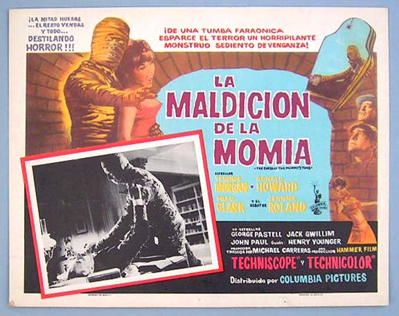 Beautiful Mexican lobby card (11x14") from the 1964 Hammer horror film, THE CURSE OF THE MUMMY'S TOMB, which starred Terence Morgan, Ronald Howard, Fred Clark, Jeanne Roland and George Pastell. $20 each |