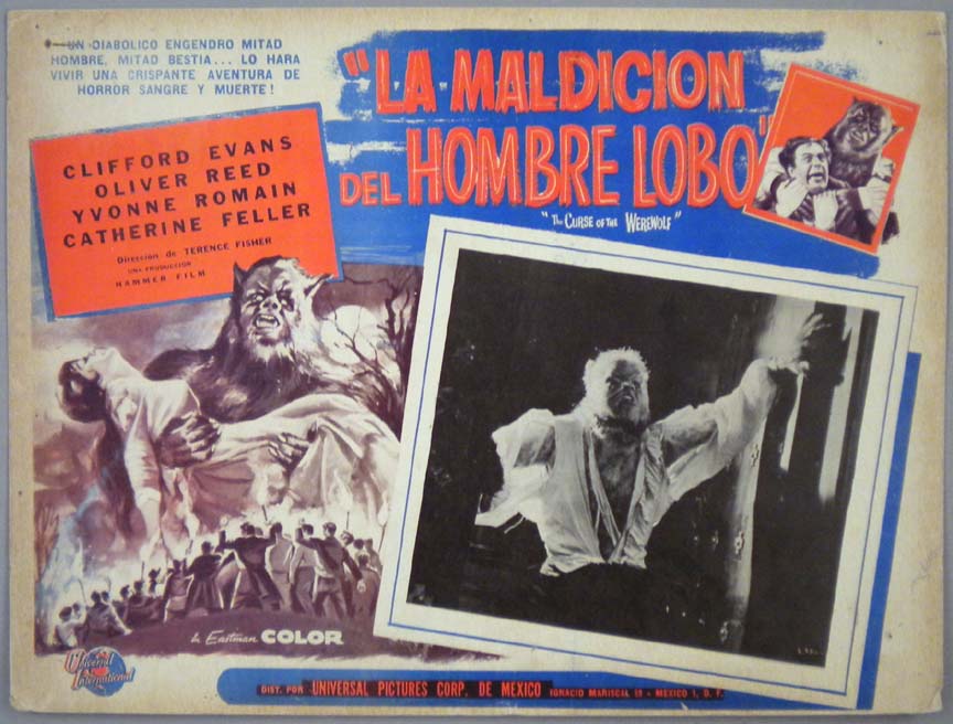 Beautiful Mexican jumbo lobby card (12.5x16.5") from the 1961 Hammer horror film, CURSE OF THE WEREWOLF, which starred Clifford Evans, Oliver Reed, Yvonne Romain and Catherine Feller. $45 |