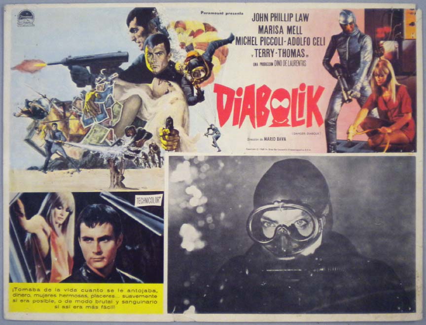 Beautiful Mexican jumbo lobby card (12.75x16.75") from the 1968 Paramount sci-fi / cult film, DANGER DIABOLIK, which starred John Philip Law, Marisa Mell, Michel Piccoli and Adolfo Celi. $25 |