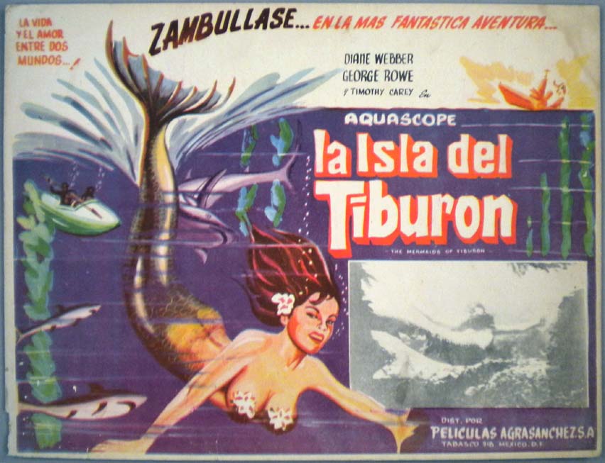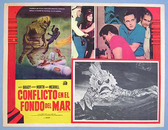 Beautiful Mexican jumbo lobby card (12.5x16.5") from the 1966 United Pictures sci-fi / scuba diving / monster film, DESTINATION INNER SPACE, which starred Scott Brady, Sheree North, Gary Merrill, Wende Wagner and Mike Road. $20 each |