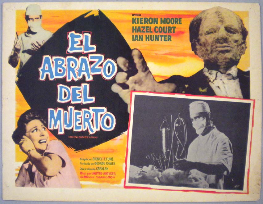 Beautiful Mexican jumbo lobby card (12.5x16.5") from the 1961 British horror / sci-fi film, DOCTOR BLOOD'S COFFIN, which starred Kieron Moore, Hazel Court, Ian Hunter, Kenneth J. Warren and Gerald Lawson. $20 |