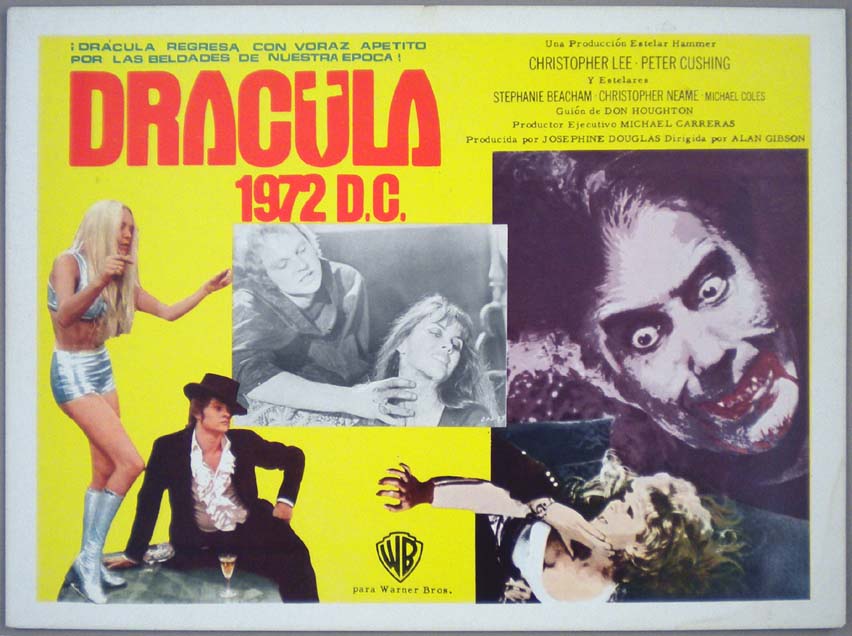 Beautiful Mexican jumbo lobby card (12x16.25") from the 1972 Hammer / Warner Brothers horror / vampire film, DRACULA A.D. 1972, which starred Christopher Lee, Peter Cushing, Stephanie Beacham, Christopher Neame and Michael Coles. $20 each |