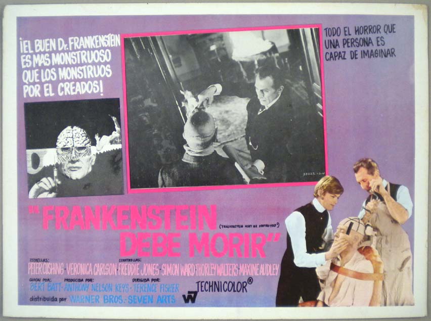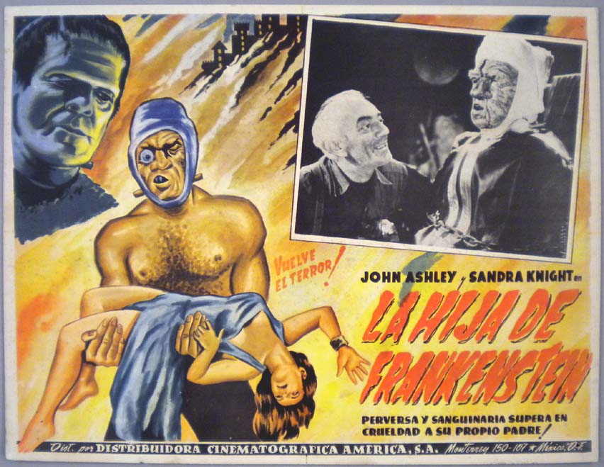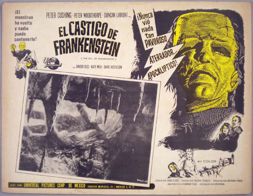Classic Mexican jumbo lobby card (12.5x16.25") from the 1964 Hammer sci-fi / horror film, THE EVIL OF FRANKENSTEIN, which starred Peter Cushing, Peter Woodthorpe, Duncan Lamont, Sandor Eles and Katy Wild. $20 |