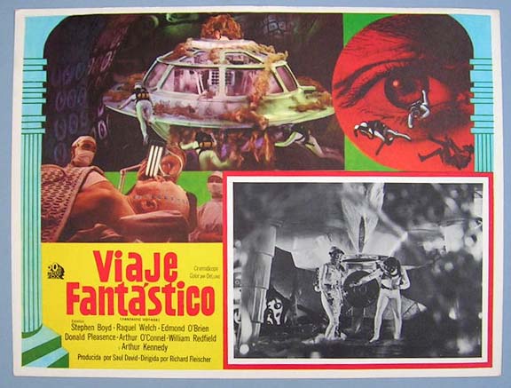 Beautiful Mexican jumbo lobby card (12.5x16.5") from the 1966 20th Century Fox sci-fi / scuba diving film, FANTASTIC VOYAGE, which starred Stephen Boyd, Raquel Welch, Edmond O'Brien, Donald Pleasence, Arthur O'Connell, William Redfield and Arthur Kennedy. $25 each |