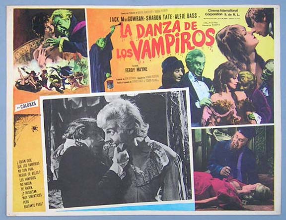 Beautiful Mexican jumbo lobby card (12.5x16.5") from the 1967 MGM comedy / horror film, FEARLESS VAMPIRE KILLERS, which starred Jack MacGowran, Roman Polanski, Alfie Bass, Jessie Robins, Sharon Tate, Ferdy Mayne, Iain Quarrier, Terry Downes, Fiona Lewis, Ronald Lacey, Sydney Bromley, Andreas Malandrinos, Otto Diamant and Matthew Walters. The film was directed by Roman Polanski. FEARLESS VAMPIRE KILLERS had a pre-release title of, Your Teeth are in My Neck. $25 each |